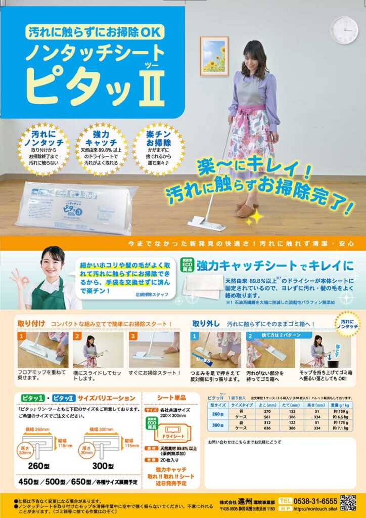 ピタッシリーズは手で触れることなく取り替え可能な床のお掃除シートです。フローリングや塩化ビニールなど家庭から病院などの床材に適した紙製お掃除シートです。ノータッチで手を汚すことなくウイルスや汚れからお掃除する人を守ります。